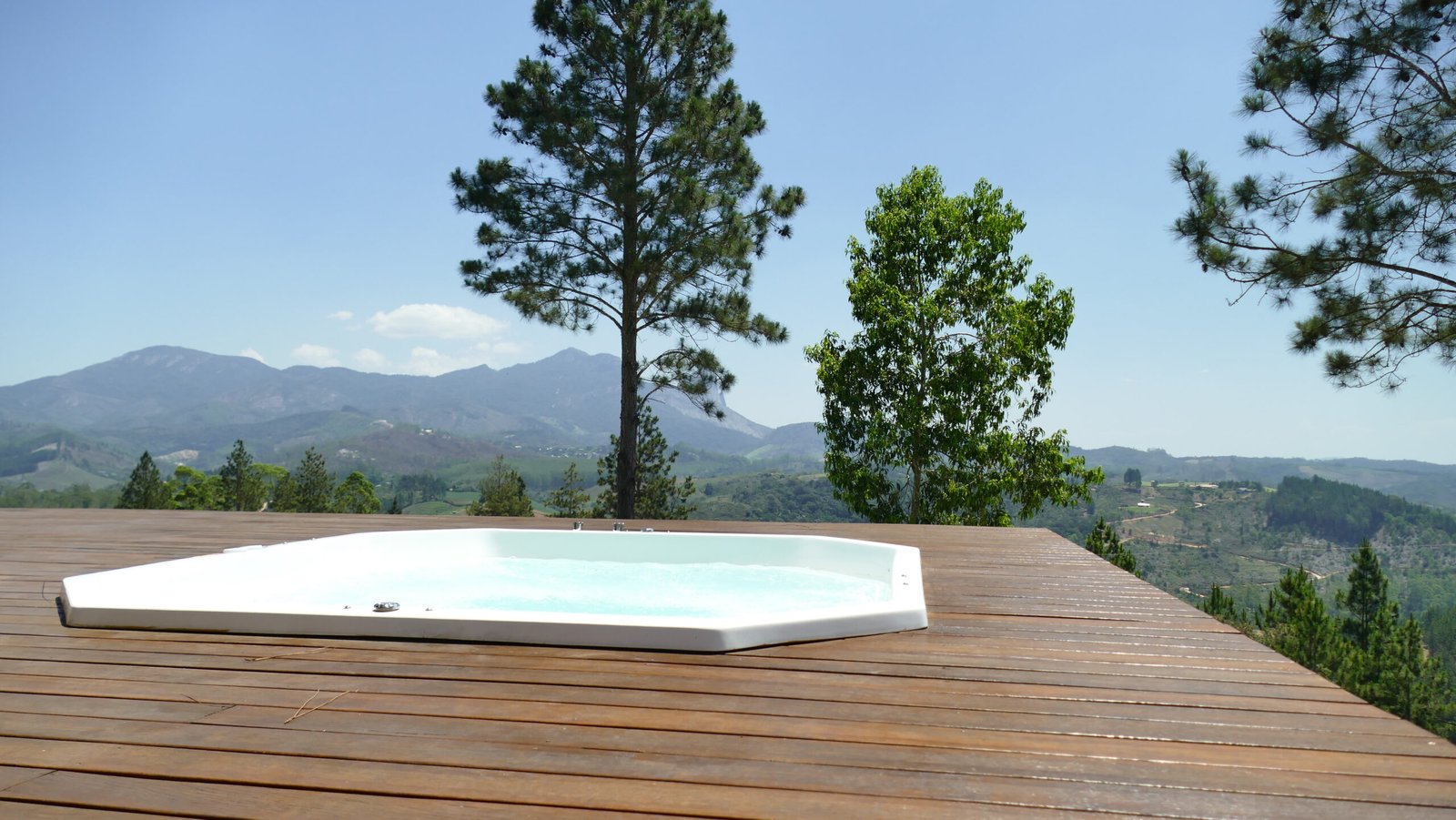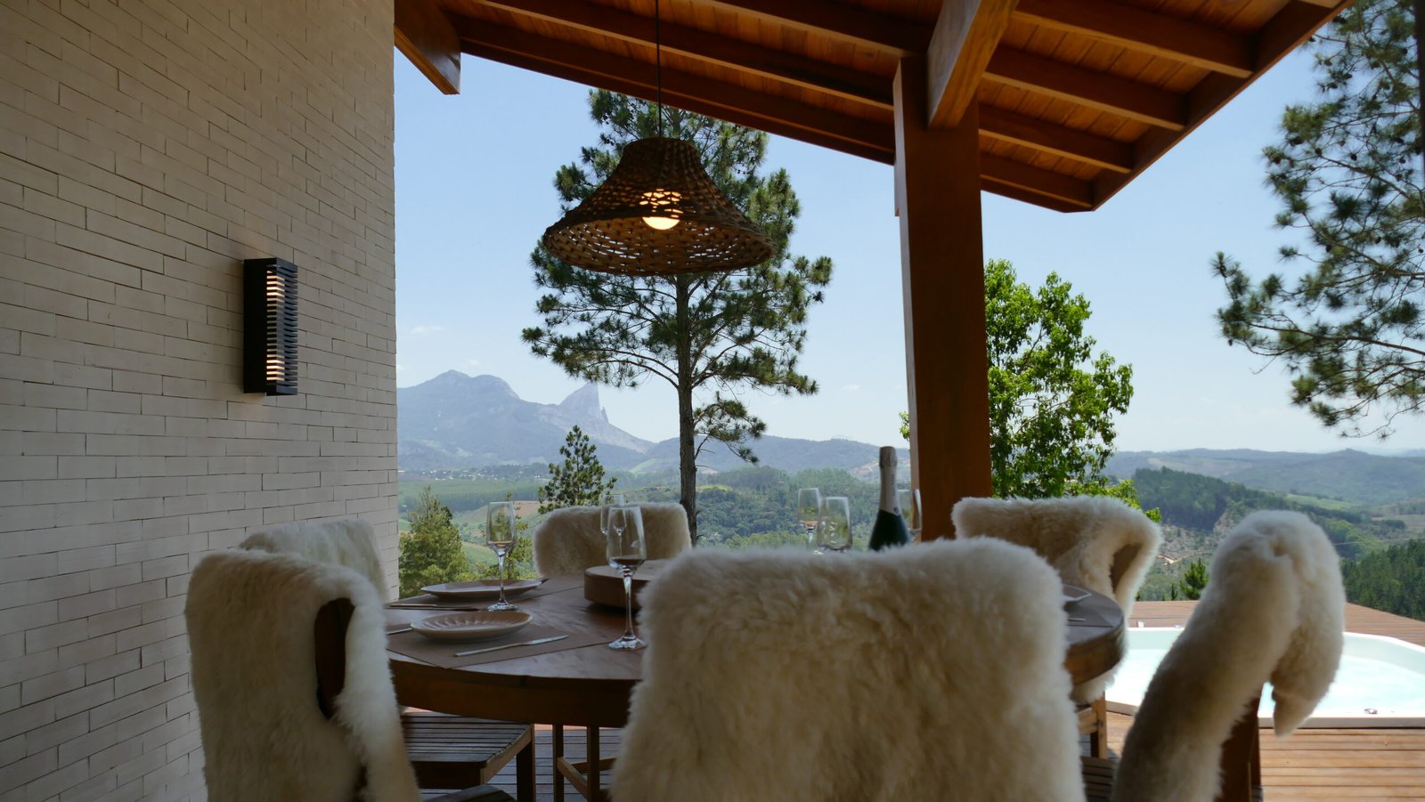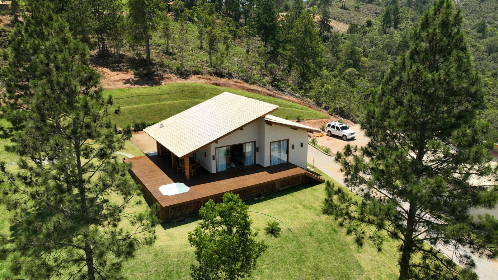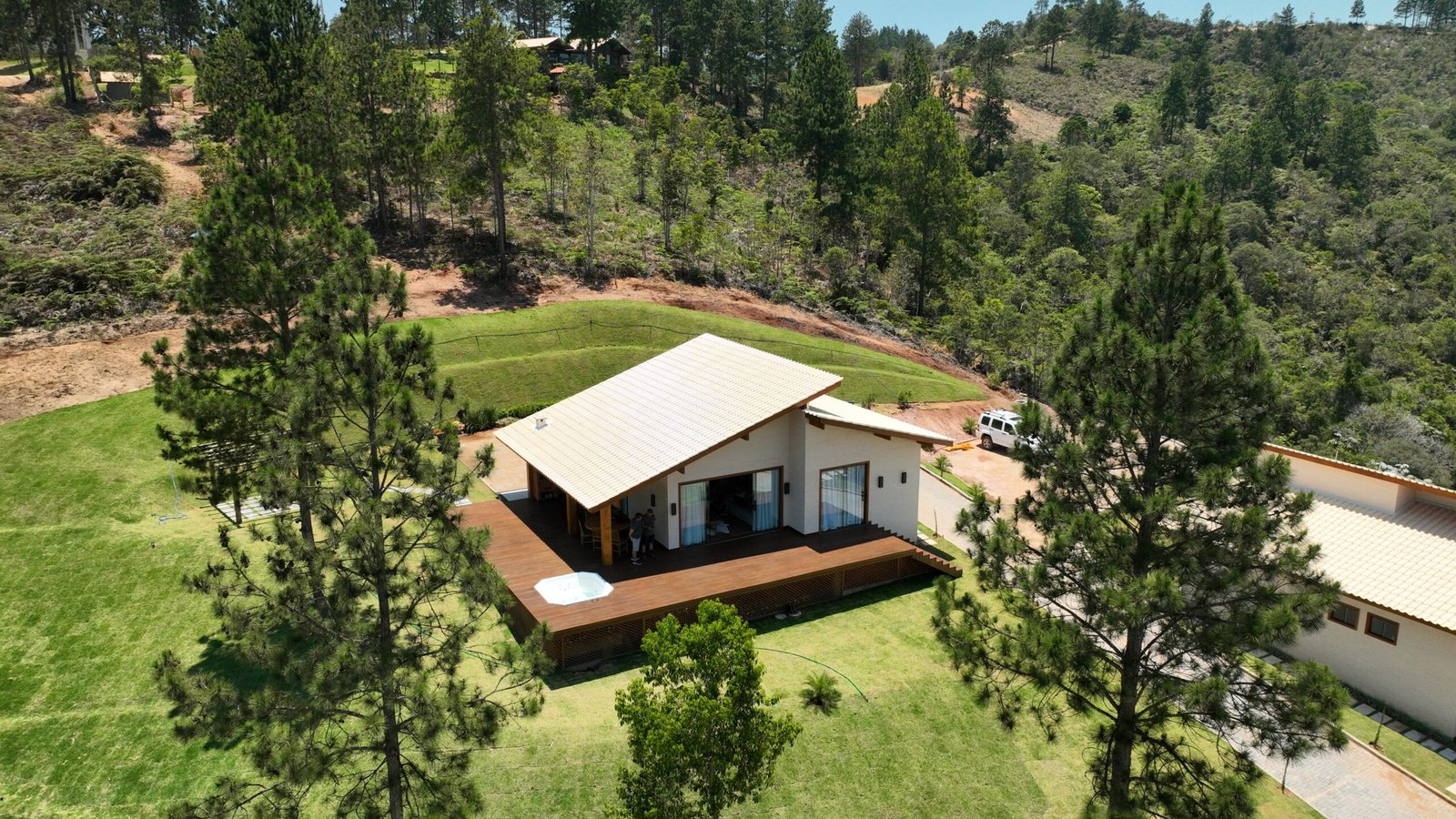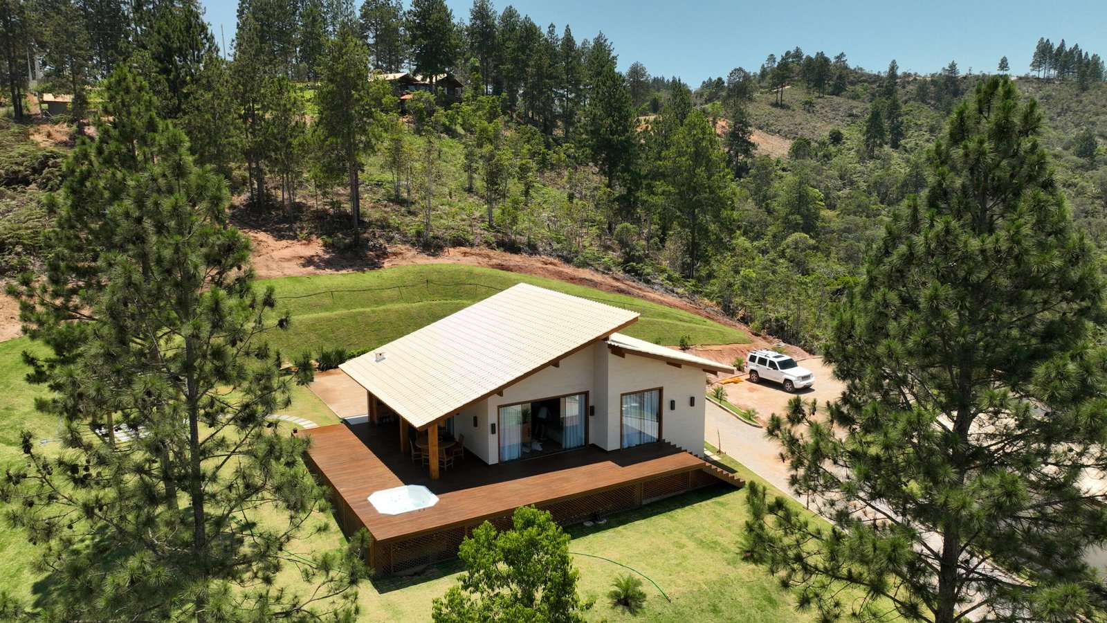 Sala de estar integrada com cozinha montada 2 quartos de casal, sendo 1 suíte Banheiro social com alto padrão de acabamento Deck de madeira com 96 m² e banheira de hidromassagem Estacionamento para até 4 veículos Paisagismo com vista para a Pedra Azul