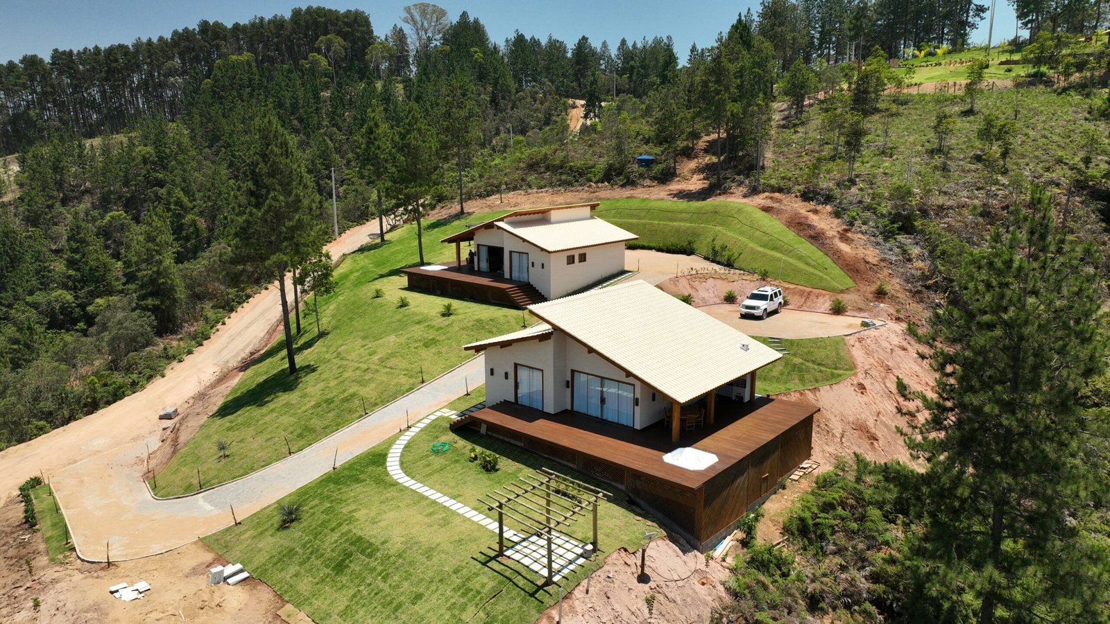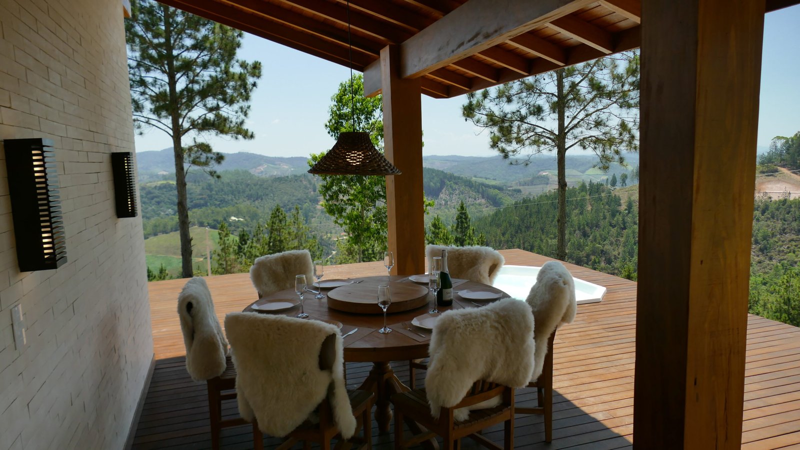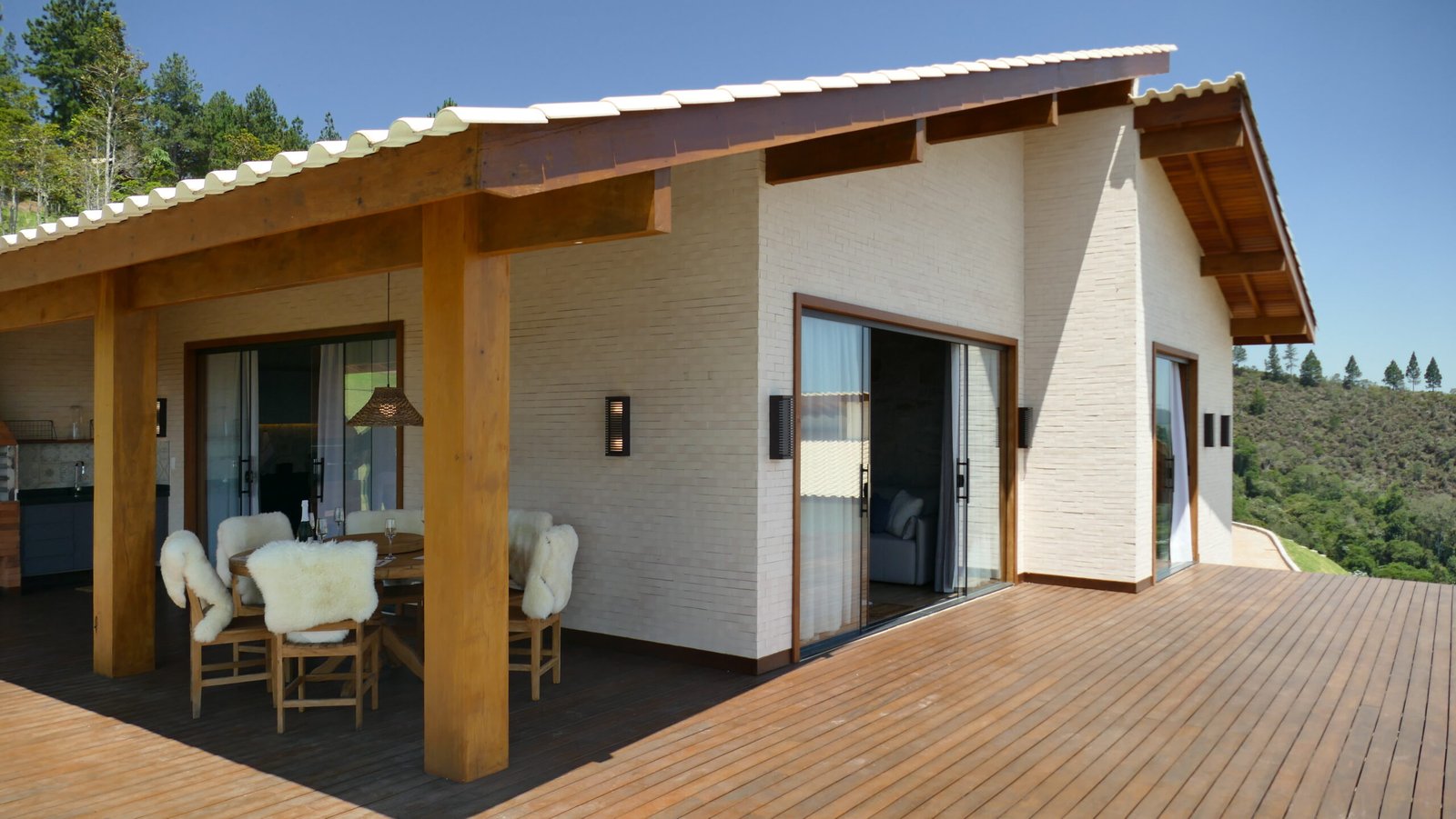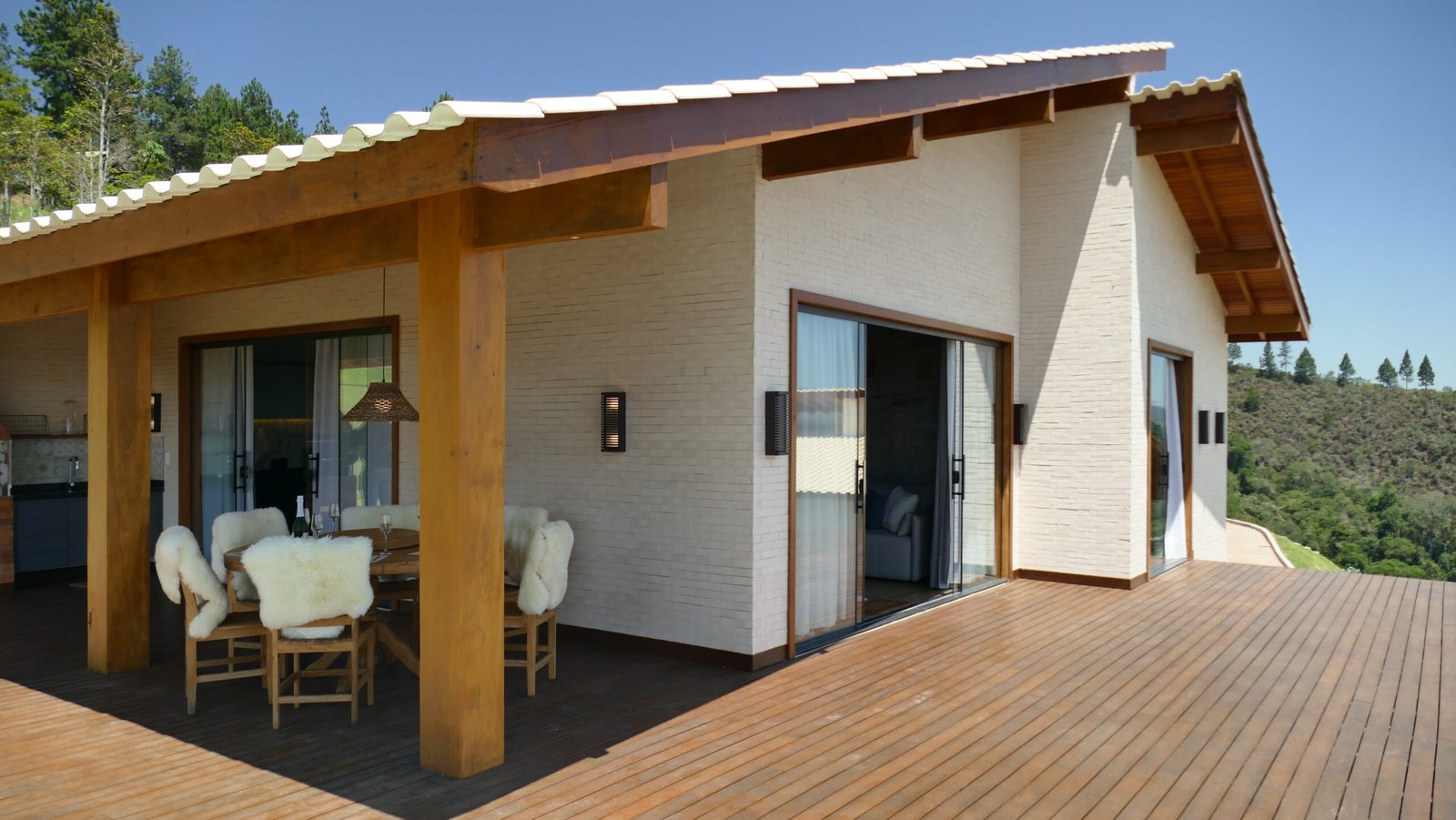 Sala de estar integrada com cozinha montada 2 quartos de casal, sendo 1 suíte Banheiro social com alto padrão de acabamento Deck de madeira com 96 m² e banheira de hidromassagem Estacionamento para até 4 veículos Paisagismo com vista para a Pedra Azul