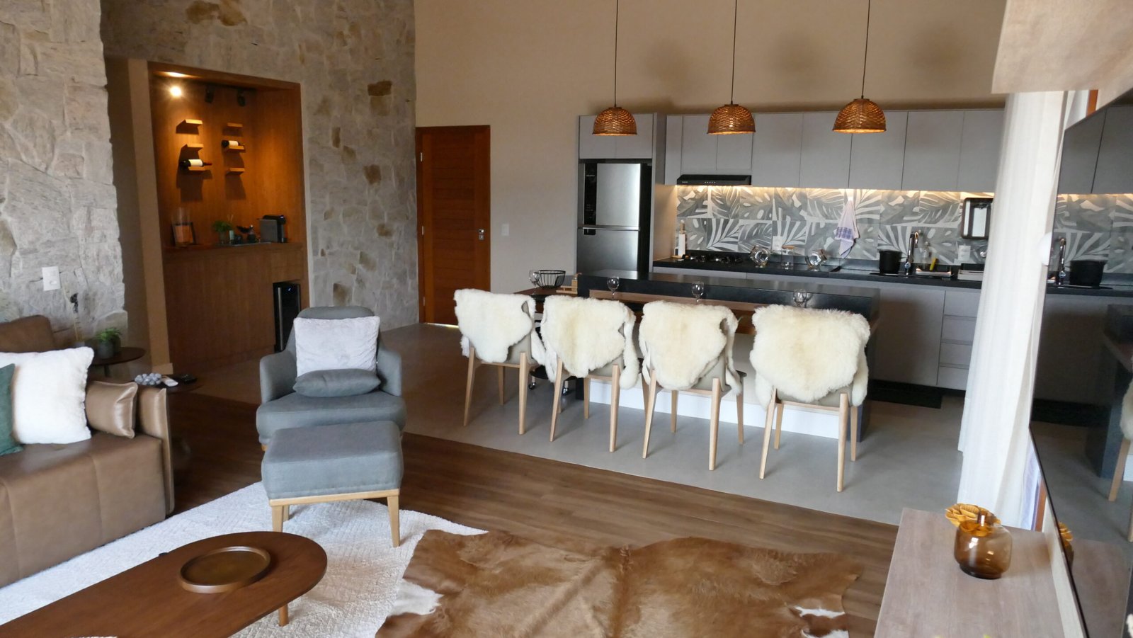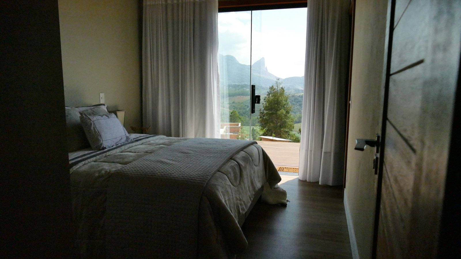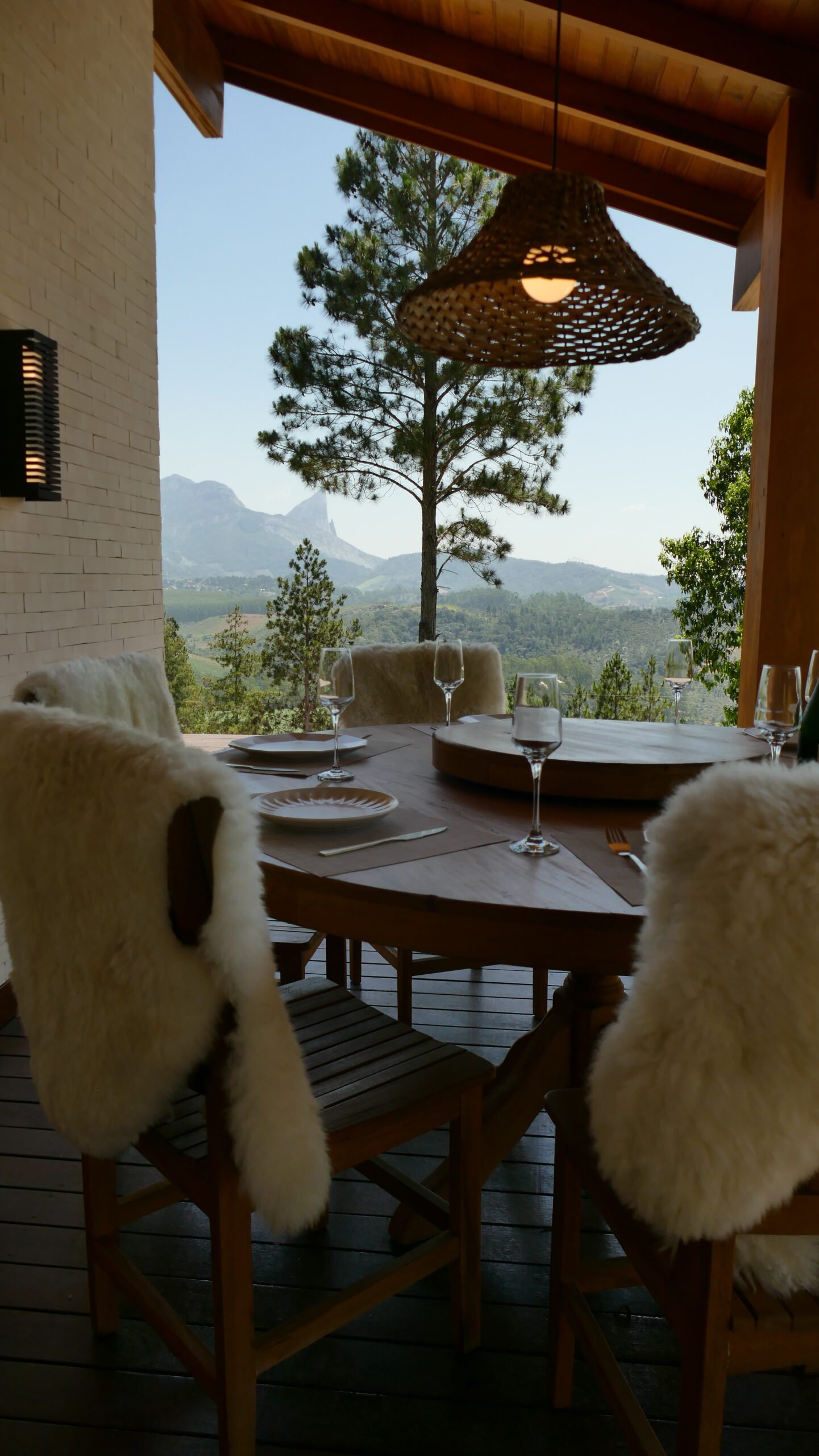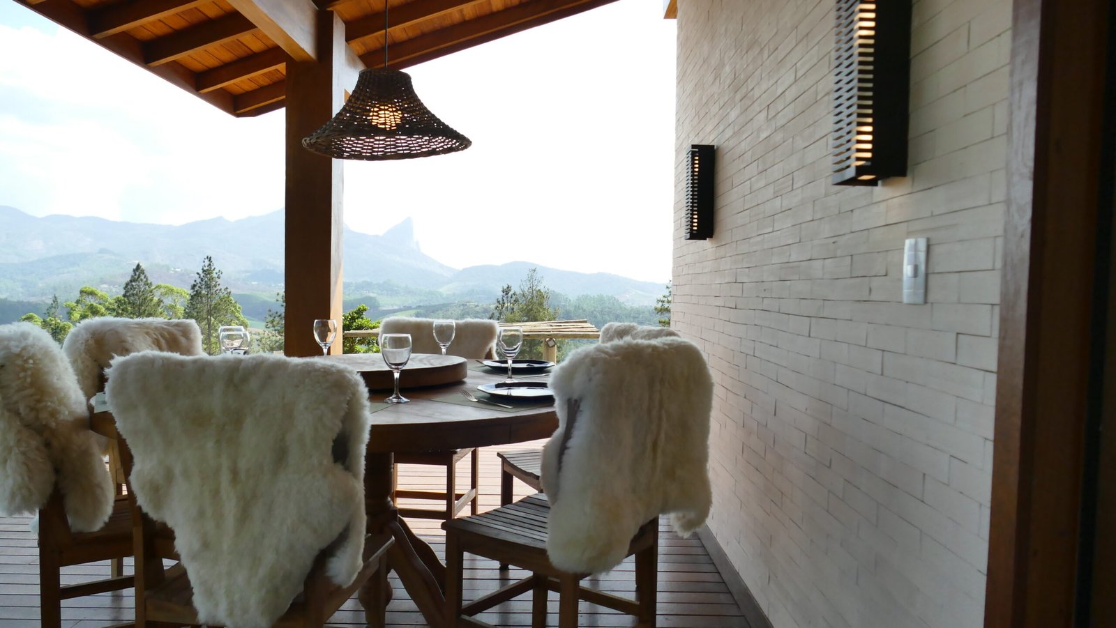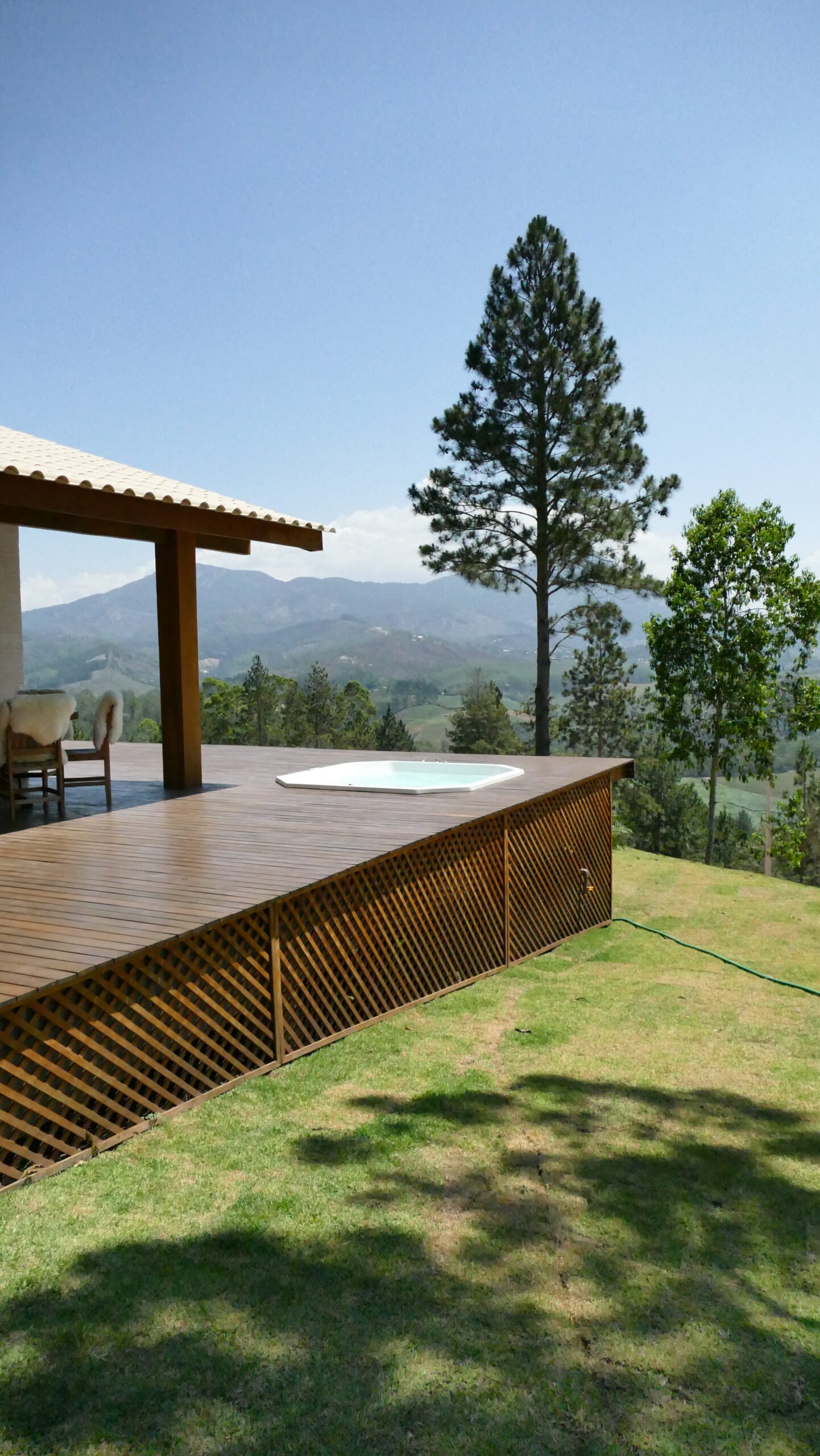 Sala de estar integrada com cozinha montada 2 quartos de casal, sendo 1 suíte Banheiro social com alto padrão de acabamento Deck de madeira com 96 m² e banheira de hidromassagem Estacionamento para até 4 veículos Paisagismo com vista para a Pedra Azul