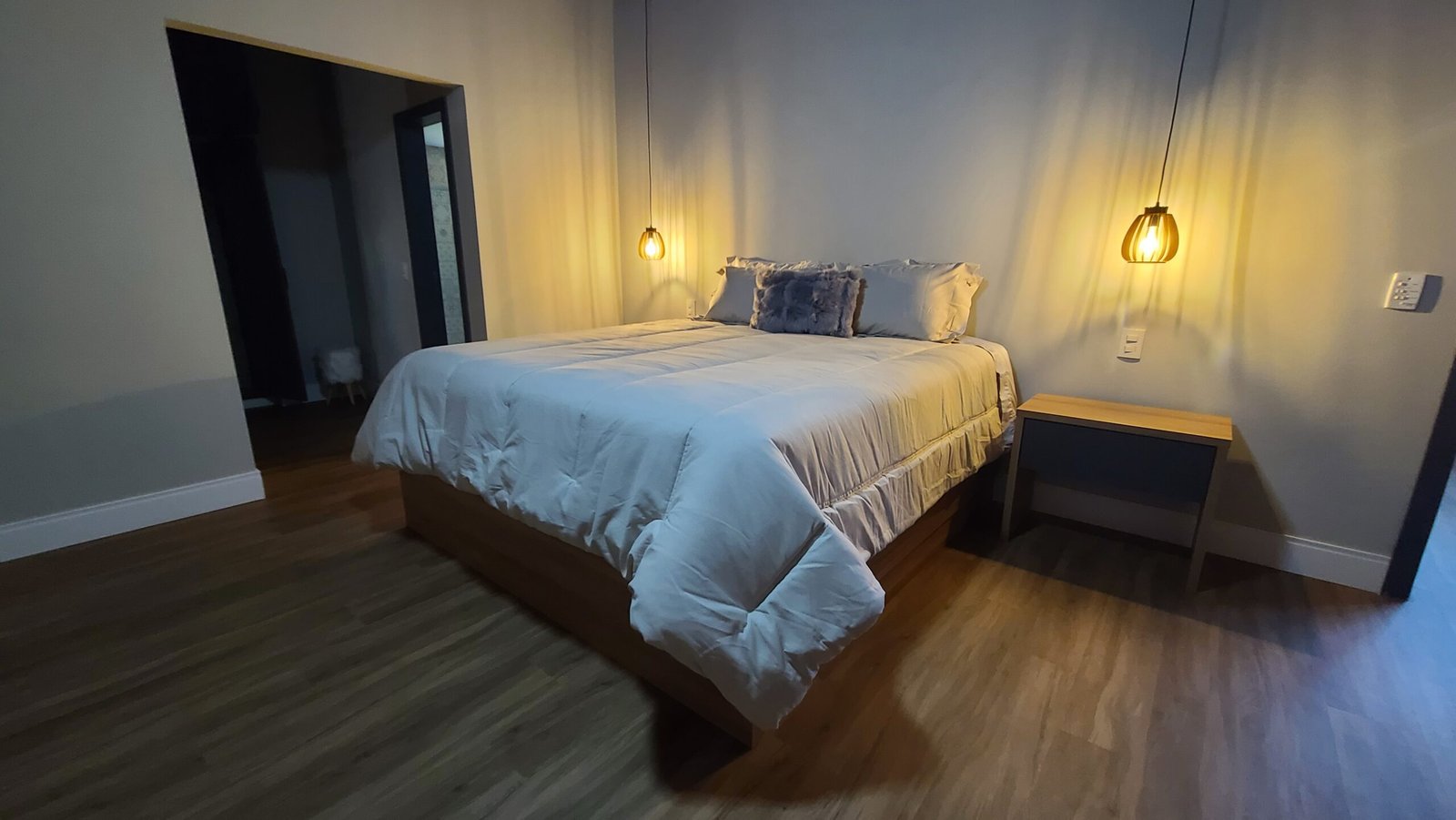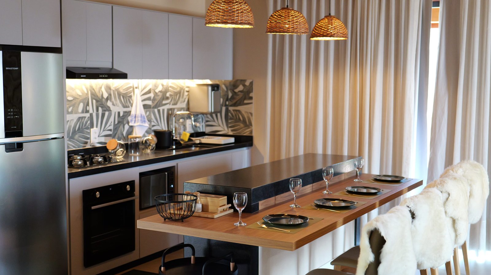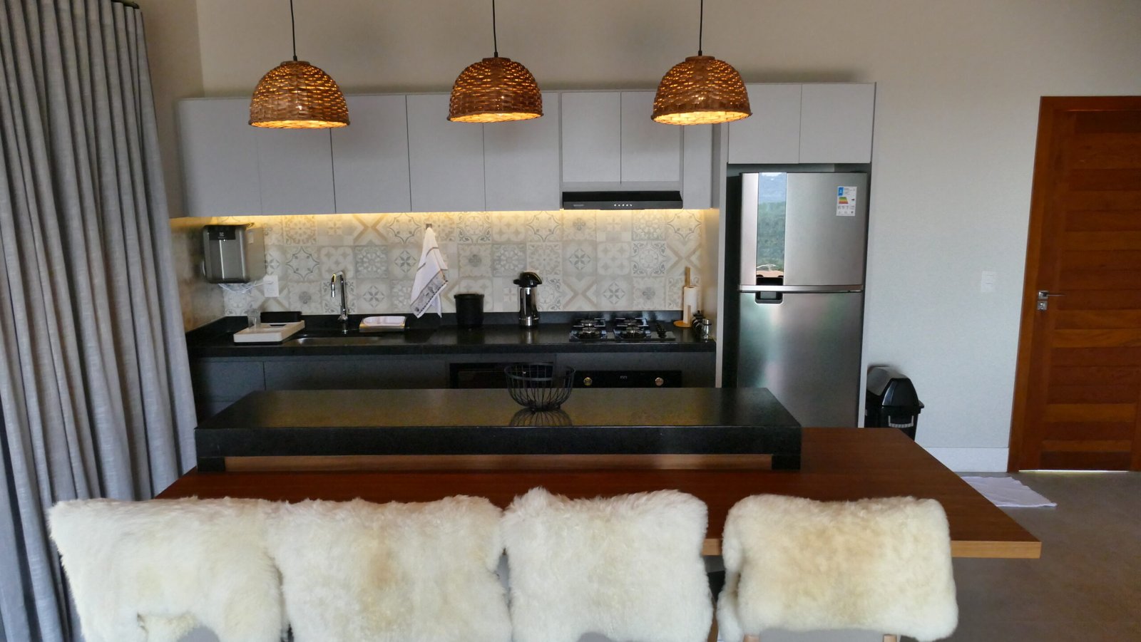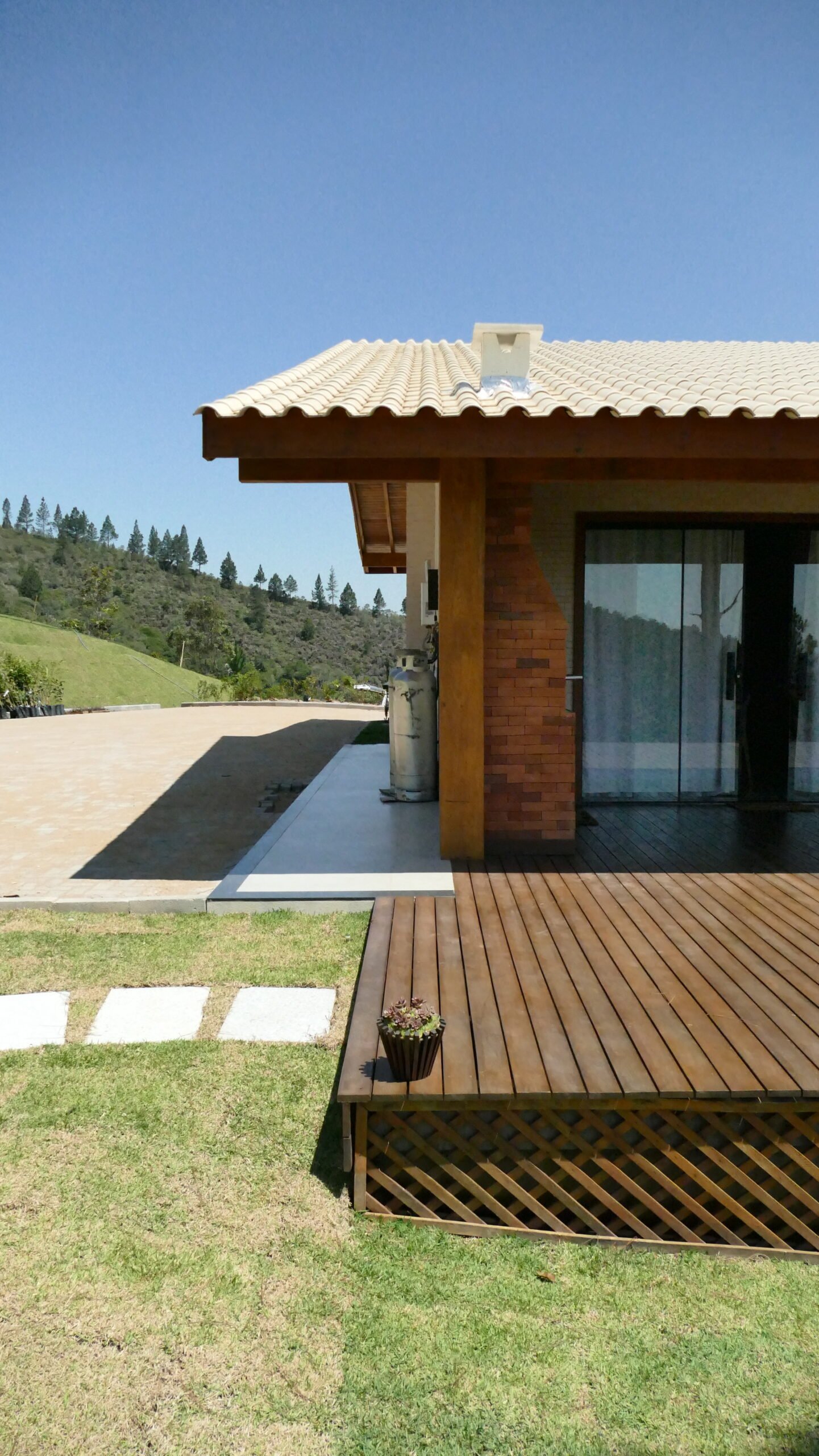 Sala de estar integrada com cozinha montada 2 quartos de casal, sendo 1 suíte Banheiro social com alto padrão de acabamento Deck de madeira com 96 m² e banheira de hidromassagem Estacionamento para até 4 veículos Paisagismo com vista para a Pedra Azul